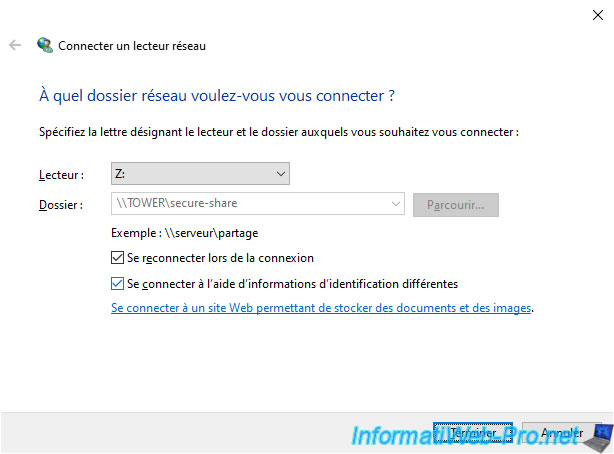 Then, check the box "Log in using different credentials" and click: Finish.