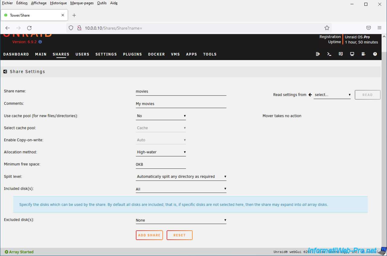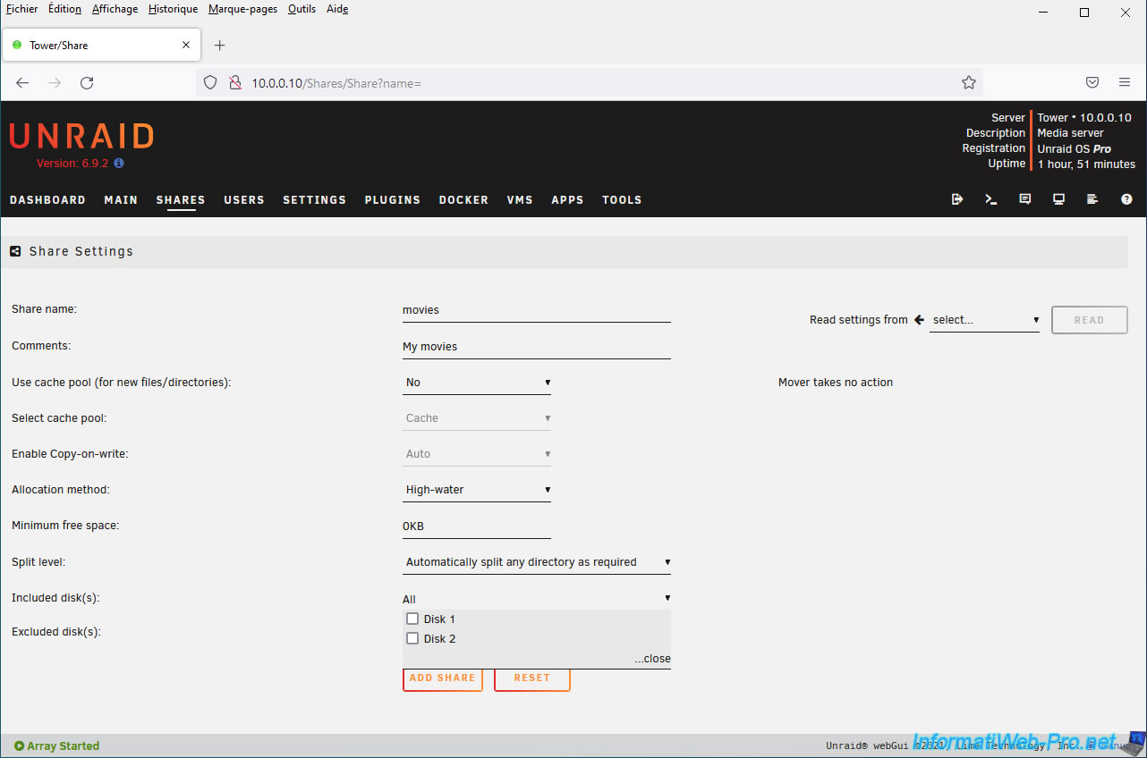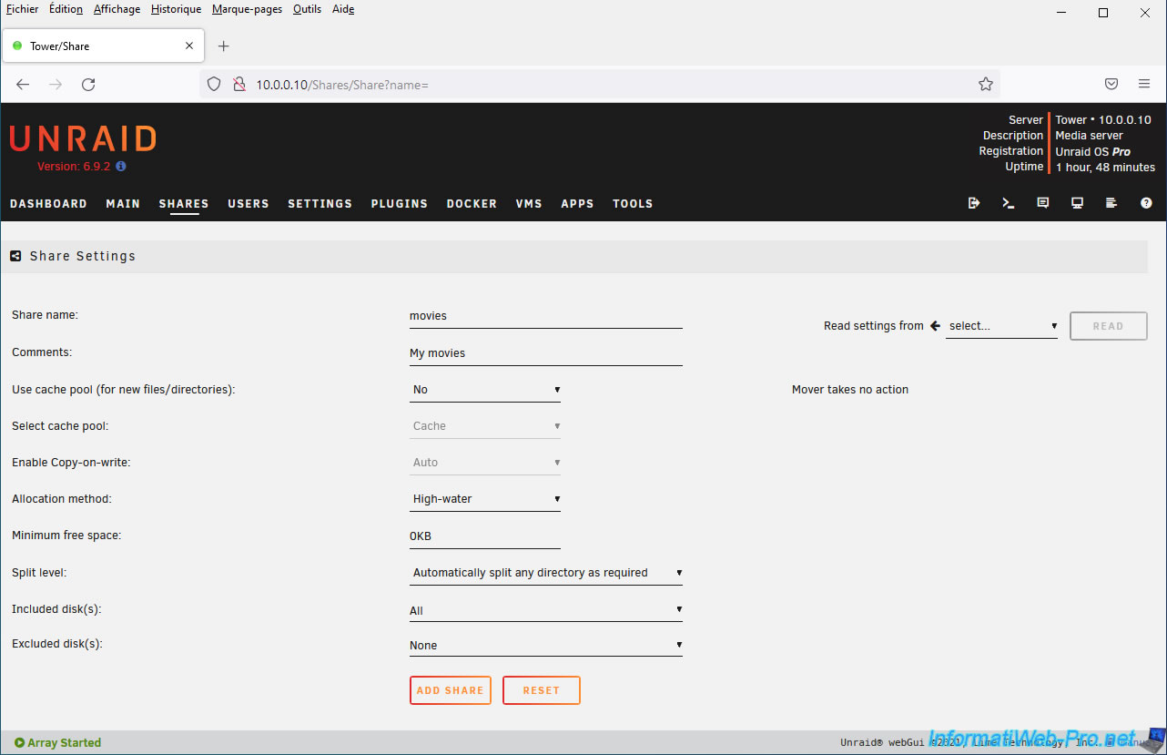 To properly organize your files on your Unraid server and access them from Docker containers, virtual machines, ..., you will need to create shares.