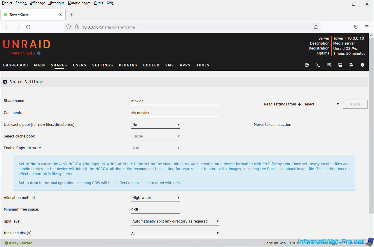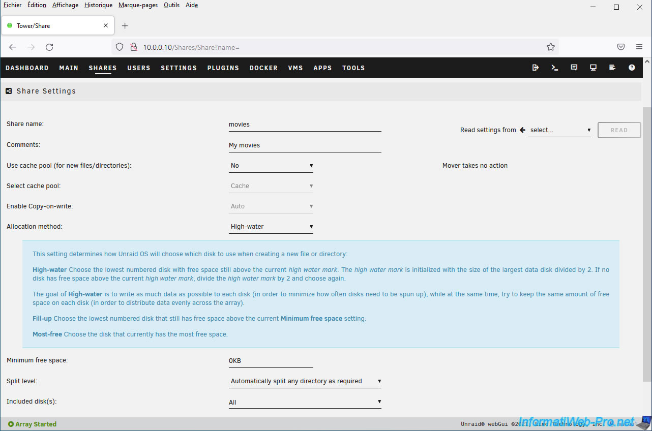 The "Allocation method" parameter allows you to choose how Unraid should choose the physical disk on which it should create the folders and files you create in this share.