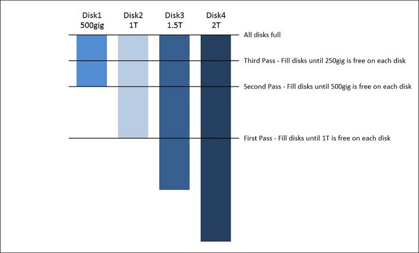 On the third pass, Unraid will fill each disk until 250 GB of free space remains. Unraid will therefore store 250 GB on each disk in this order: disk 1, disk 2, disk 3, then disk 4.