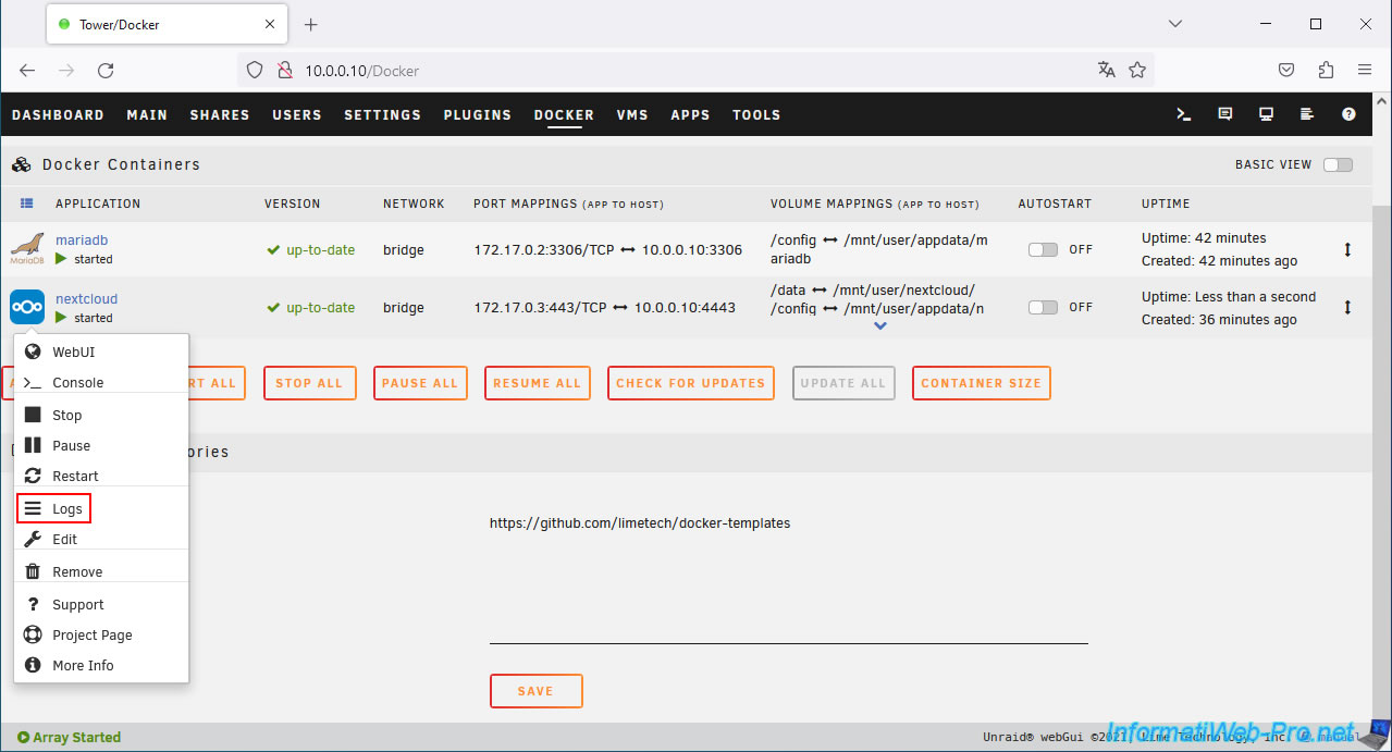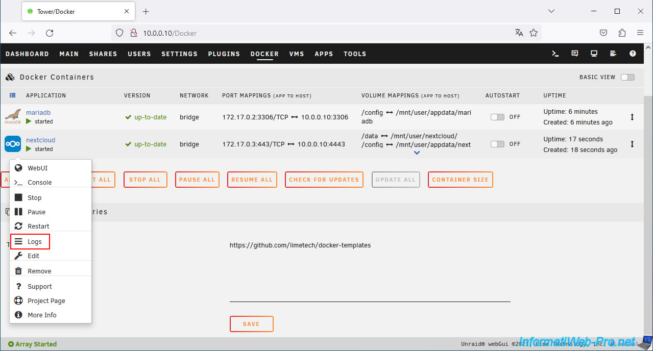 To better understand where the problem comes from, simply access the logs of your "nextcloud" container by clicking on its icon, then on: Logs.