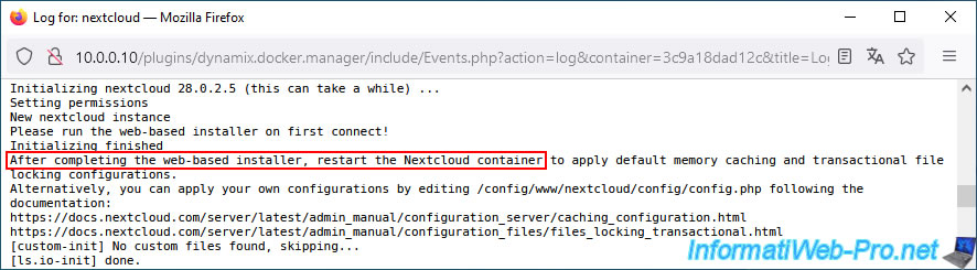 As you can see, after completing the Nextcloud installer via your web browser, you are supposed to restart your "nextcloud" container to perform some adaptations automatically, including the cache.