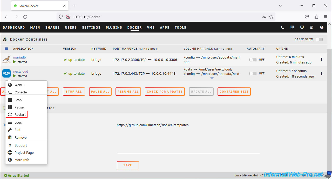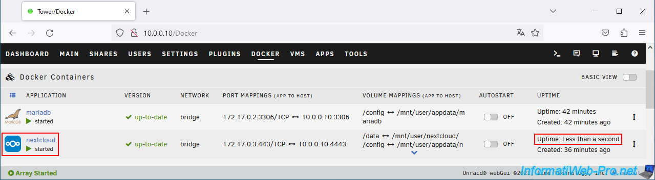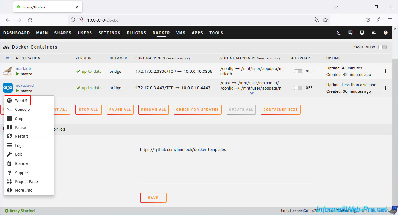 Then, reopen the Nextcloud web interface by clicking on the icon of your "nextcloud" container, then on: WebUI.