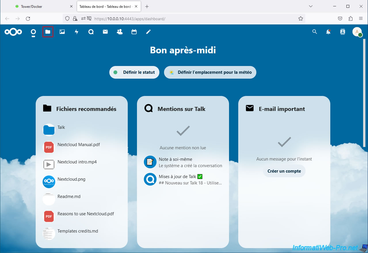 To manage your files through Nextcloud, click on the folder icon (located at the top left of the page).