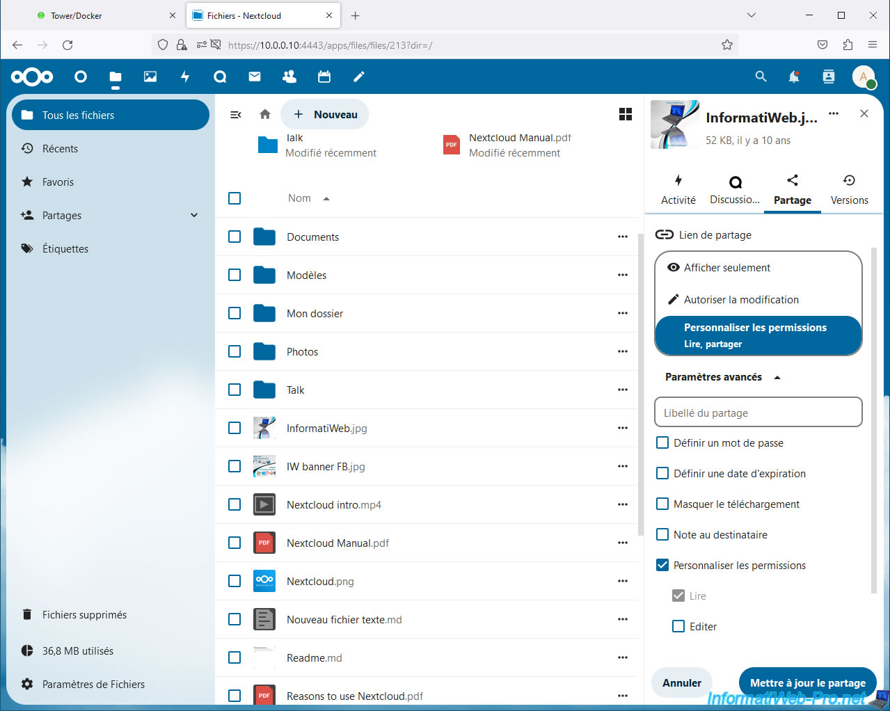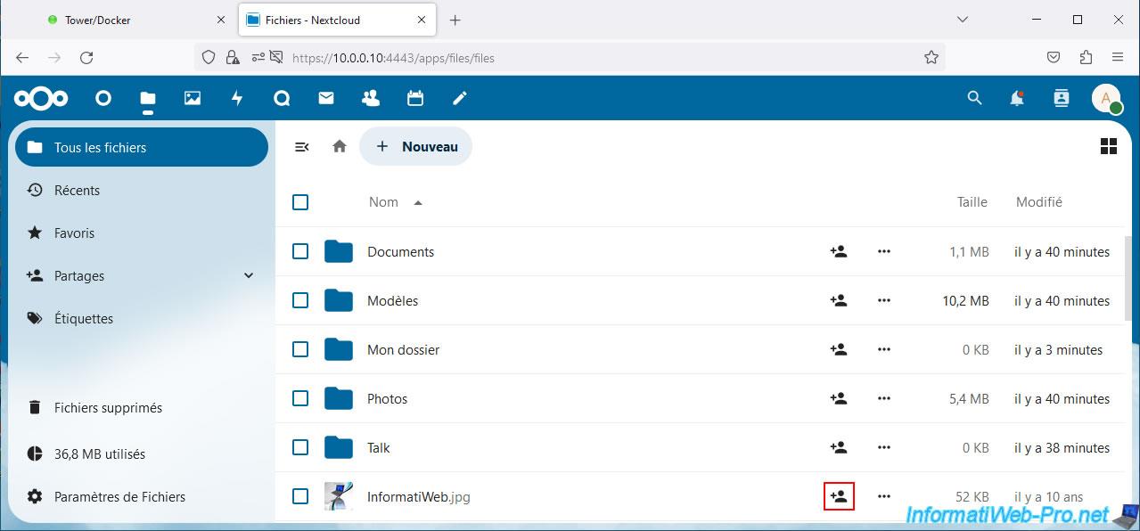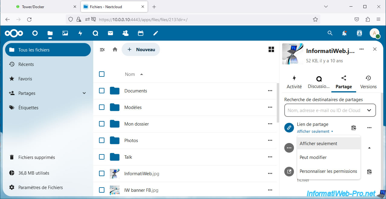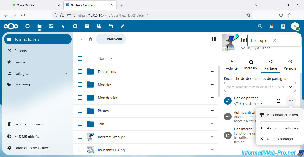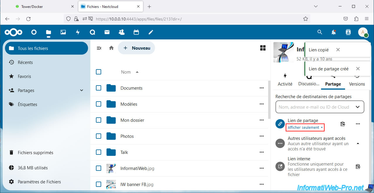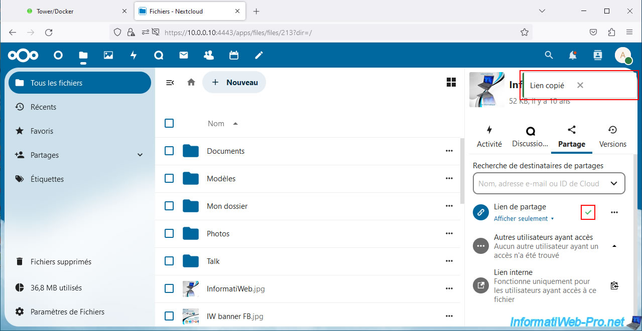 Warning : as you can see, by default, the sharing link contains the local IP address of your Unraid server.