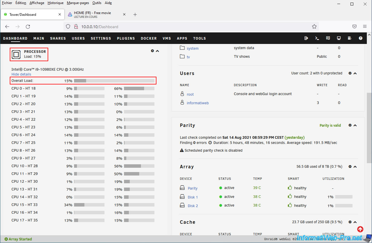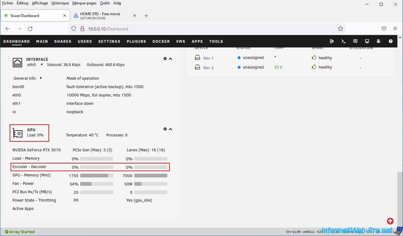 Leave the video playing and open your Unraid server dashboard in a new tab.