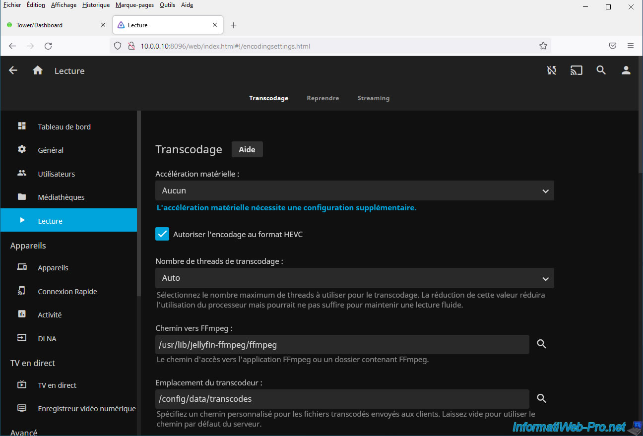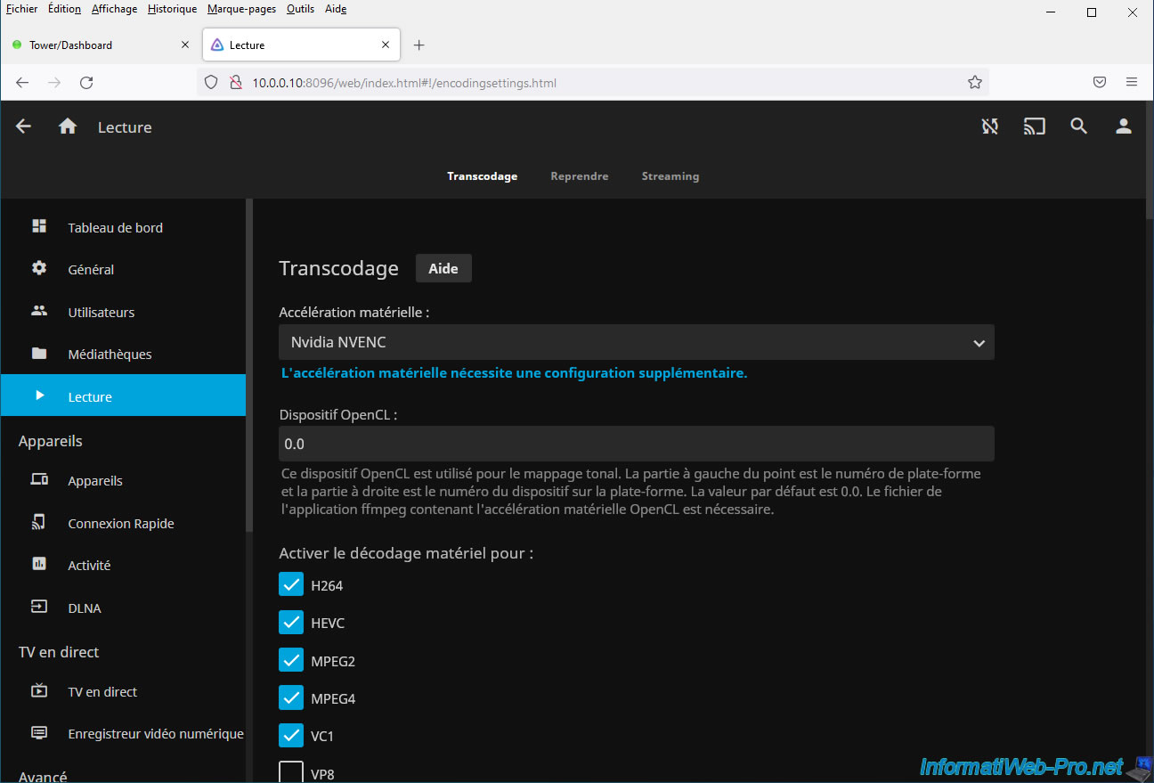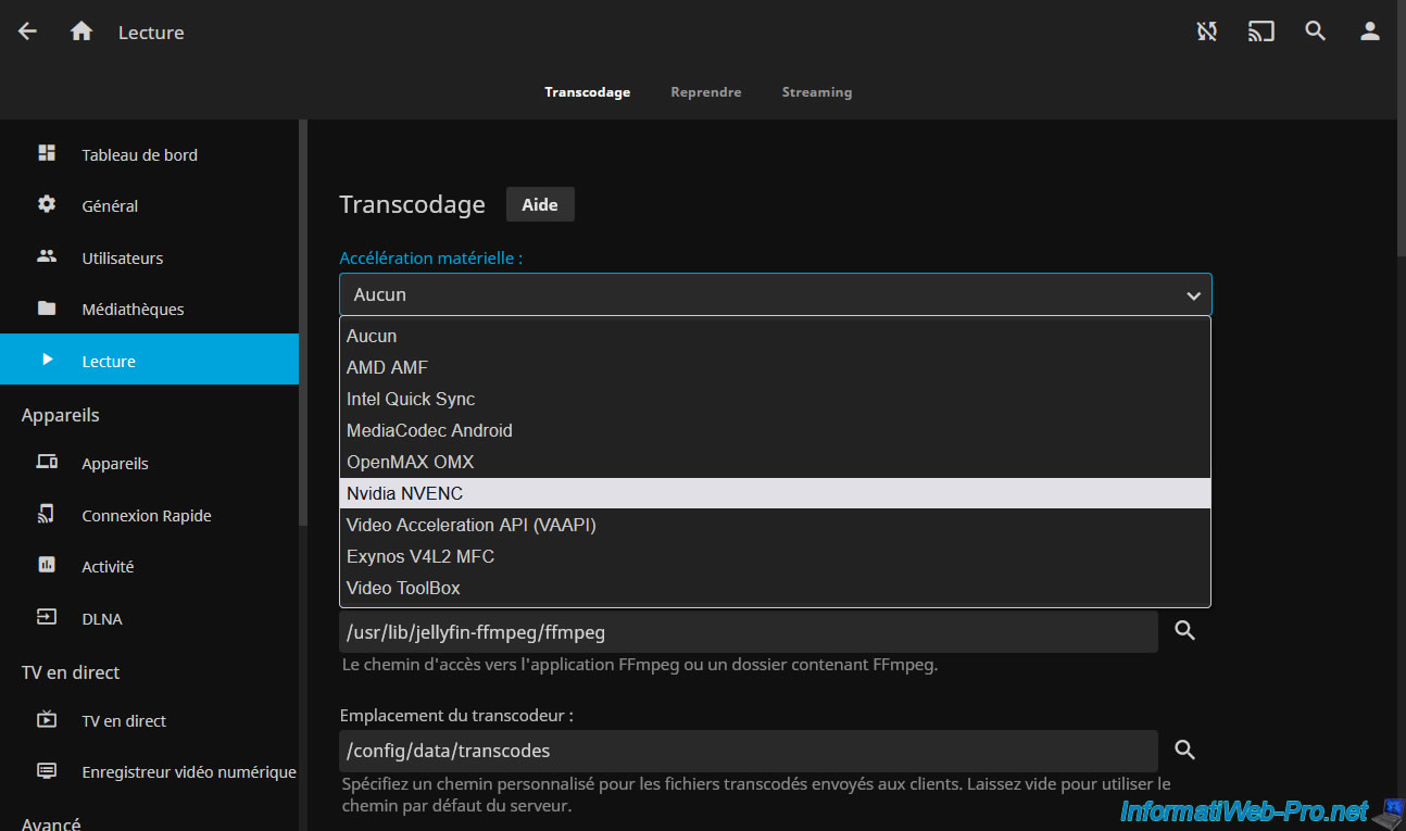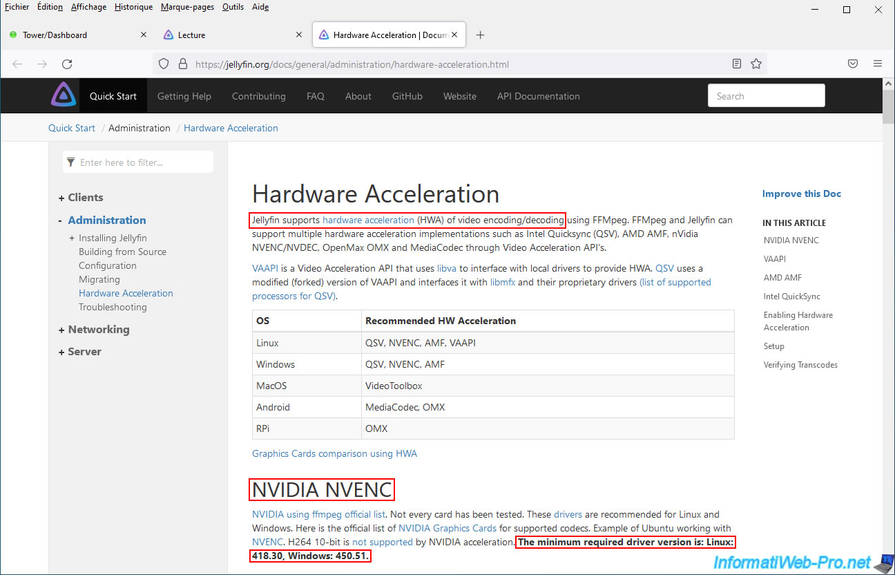 If you click on the "Hardware acceleration requires additional configuration" link, you will arrive on the "Hardware Acceleration" page of the Jellyfin site where it is notably indicated that: