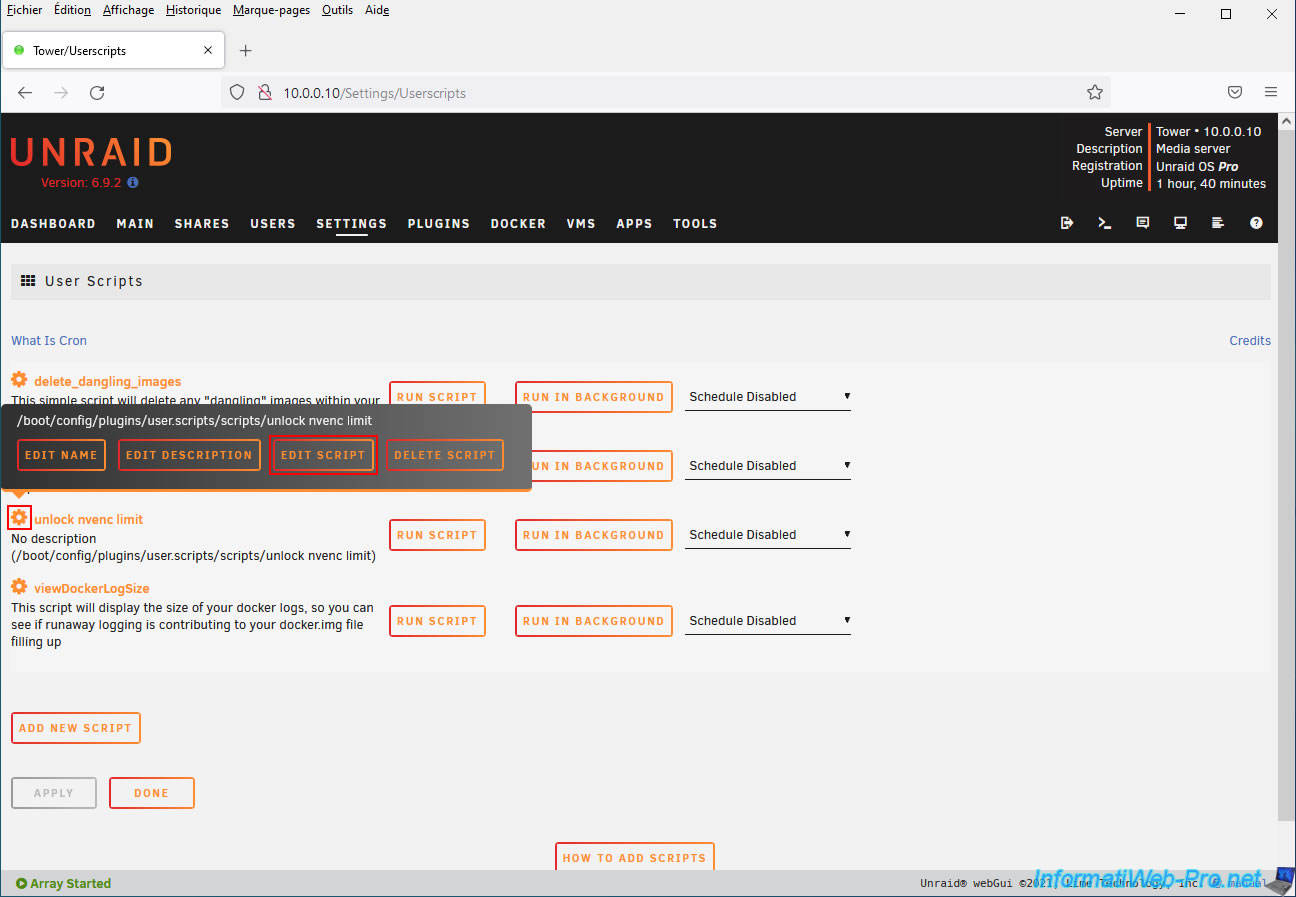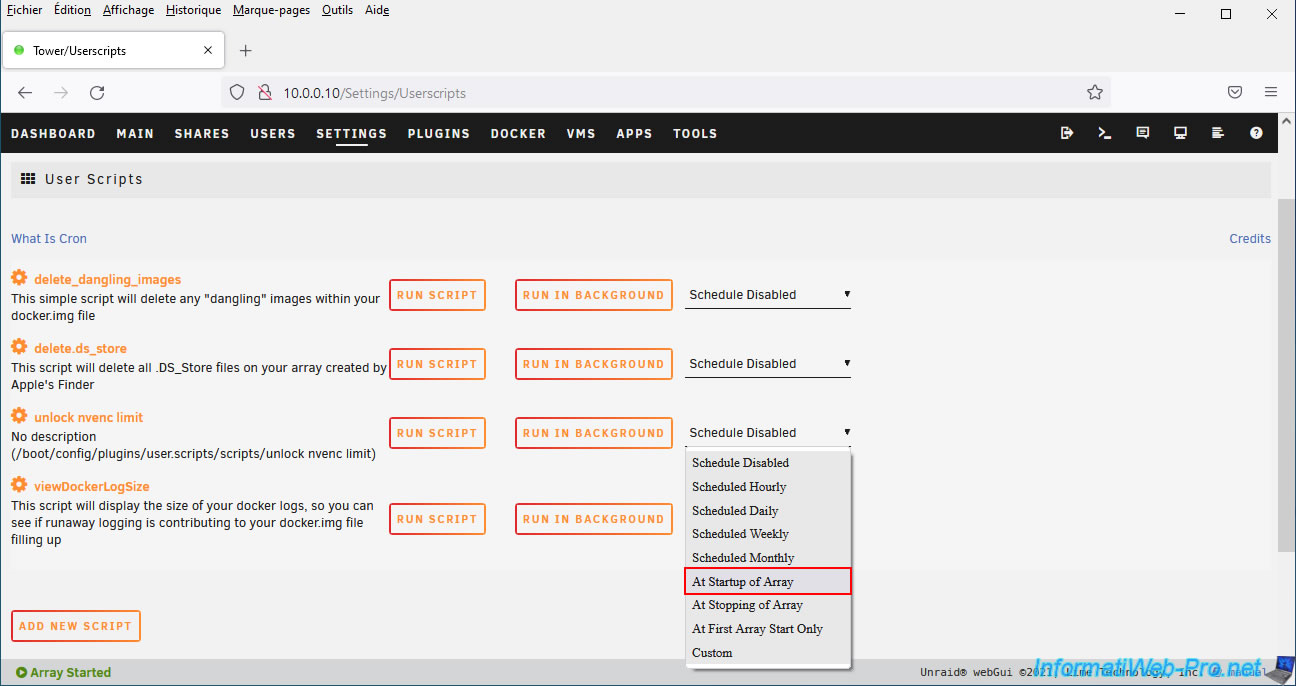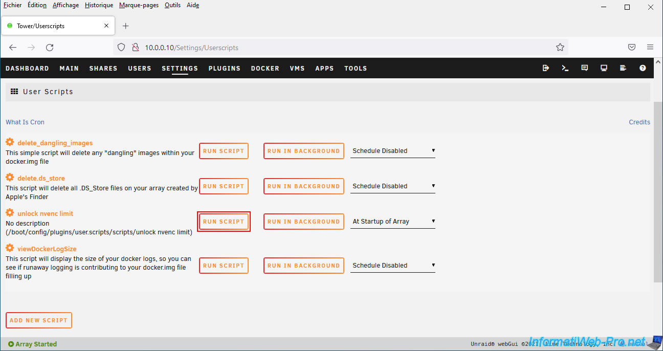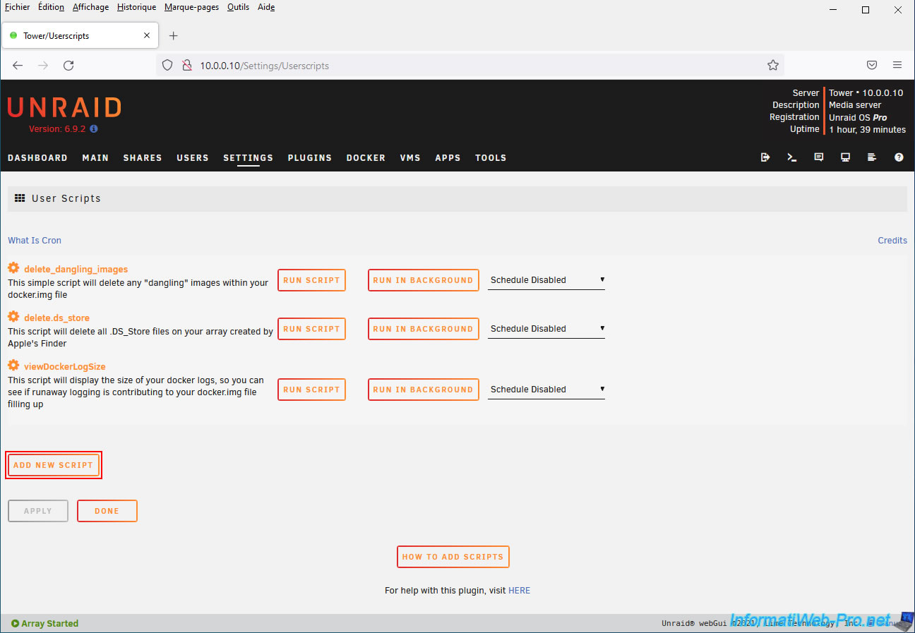 Now that the script will start automatically when your server starts (or more precisely when the array starts), run it manually for the first time by clicking on "Run script".
