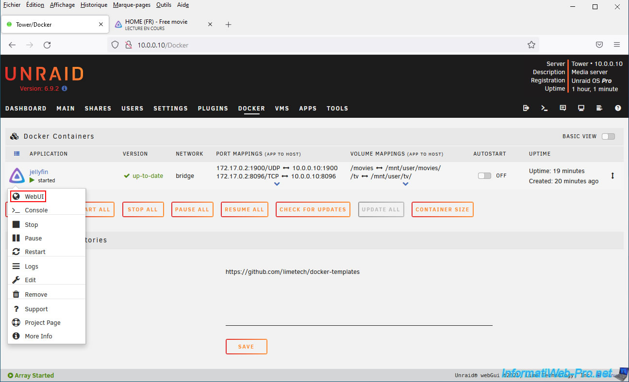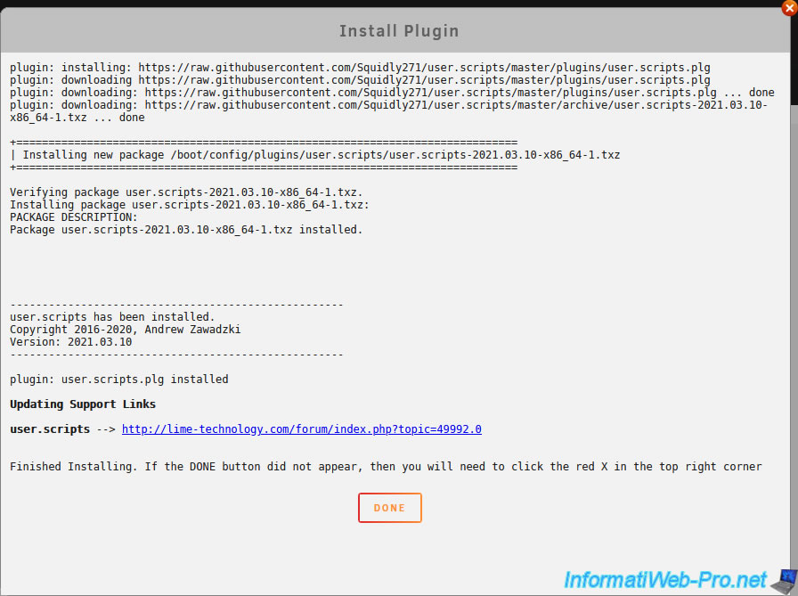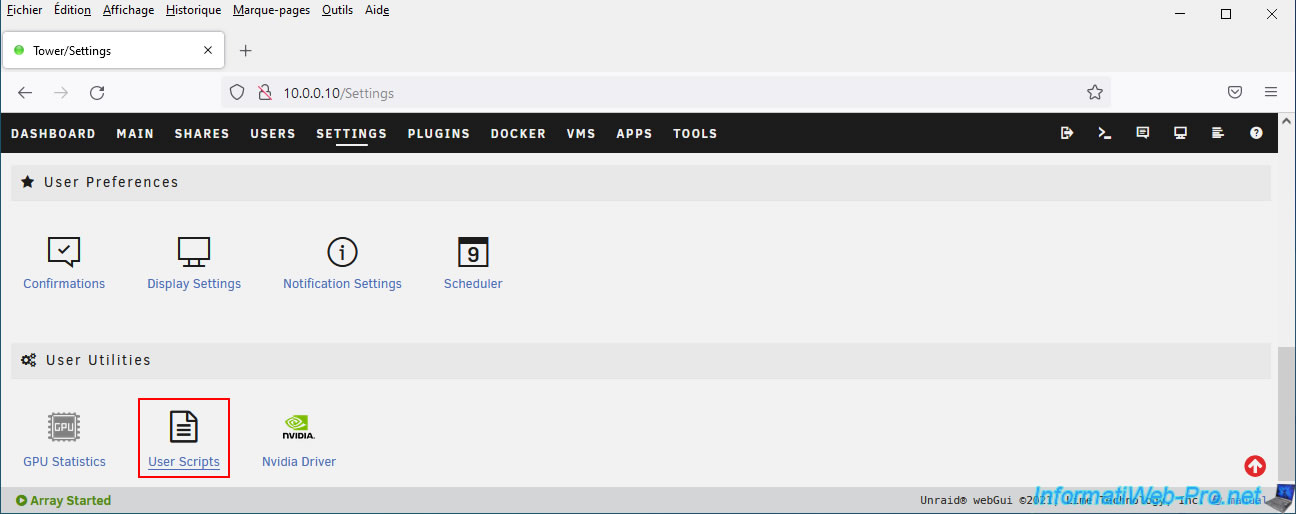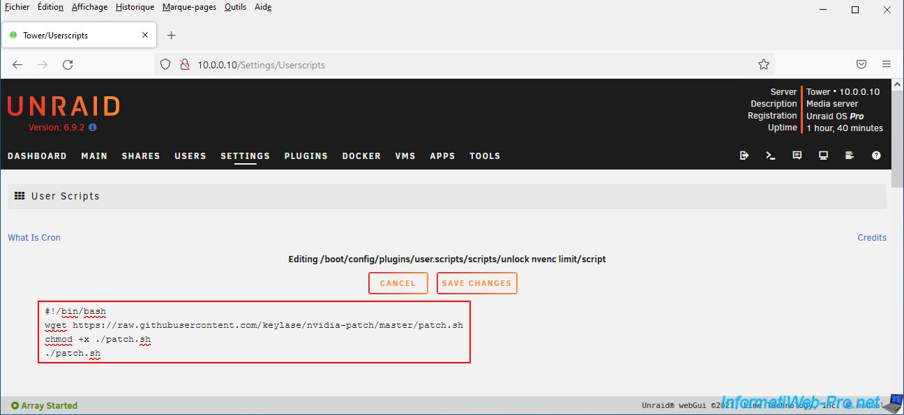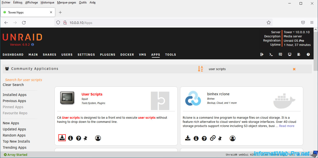 Now that the script will start automatically when your server starts (or more precisely when the array starts), run it manually for the first time by clicking on "Run script".