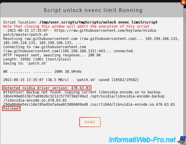 As you can see, the downloaded and executed "patch.sh" file will detect your version of the NVIDIA driver installed on your Unraid server and it will be patched.