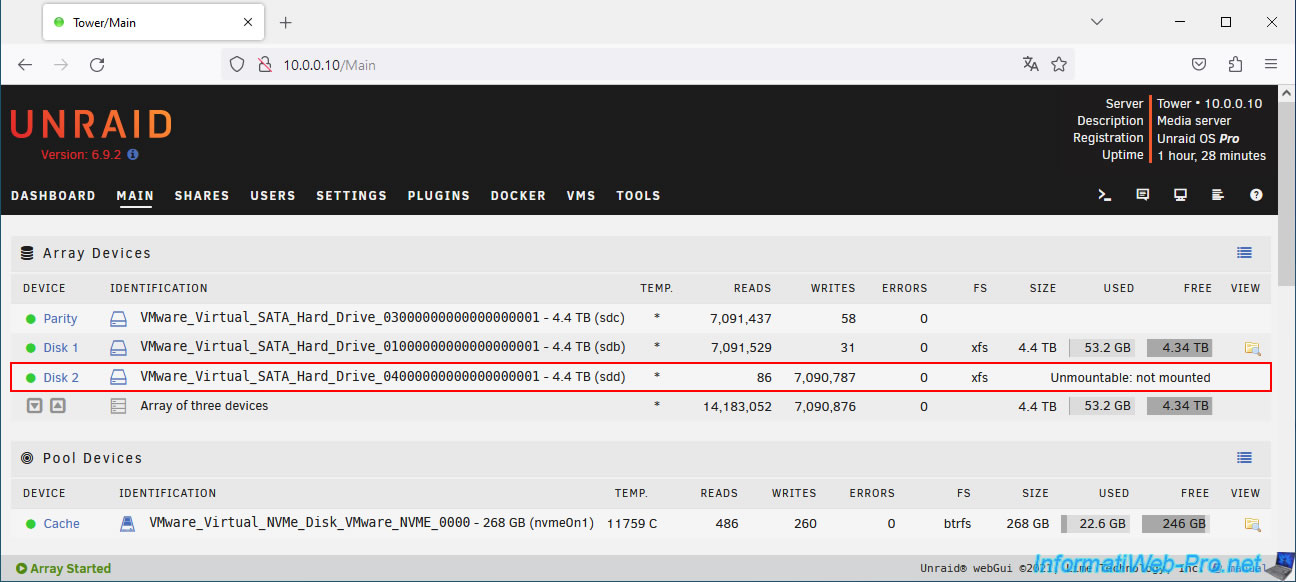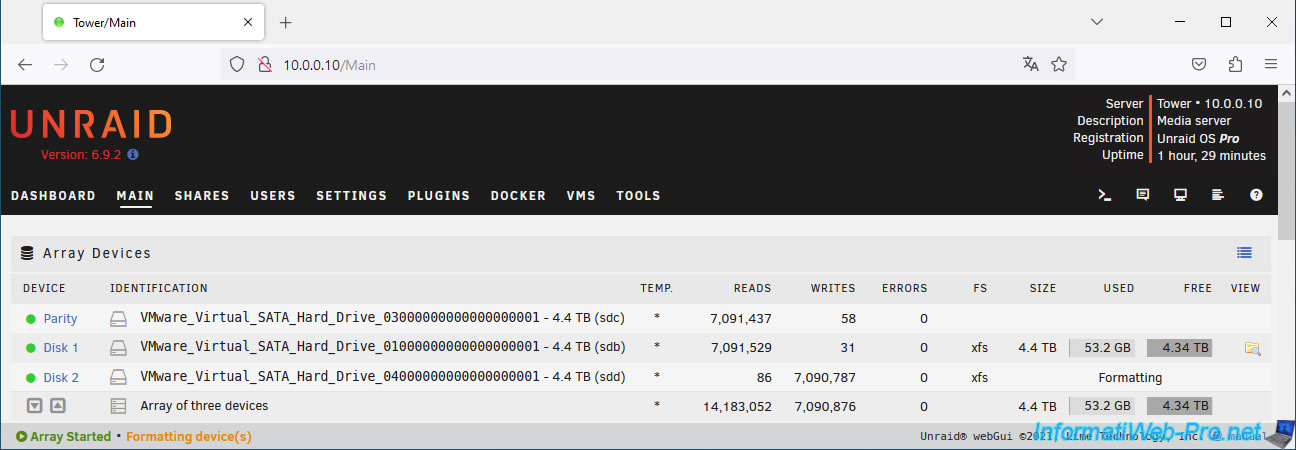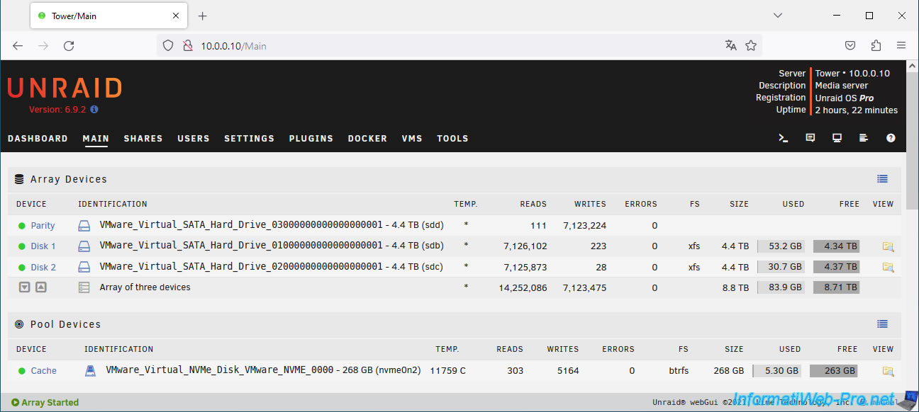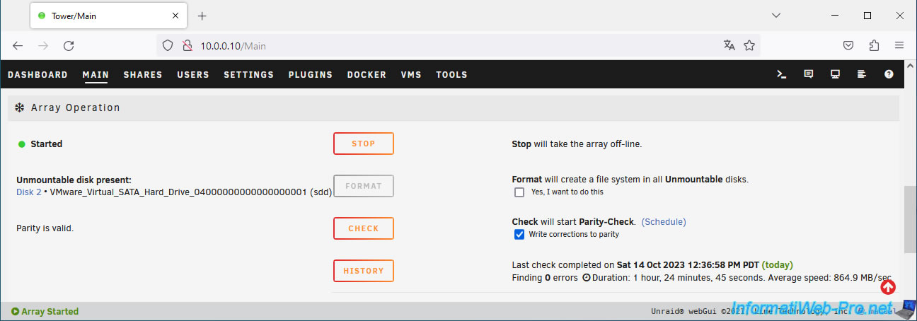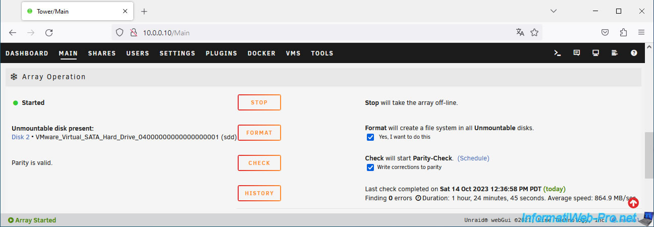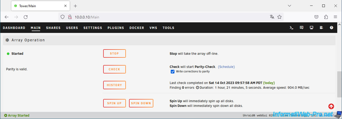 At the bottom of the page you can see that the array is started and the parity is good (Parity is valid).