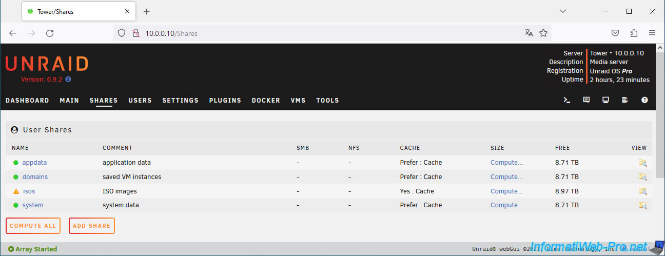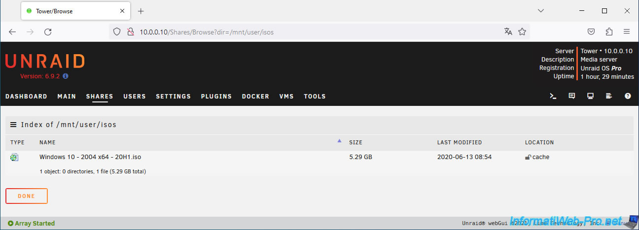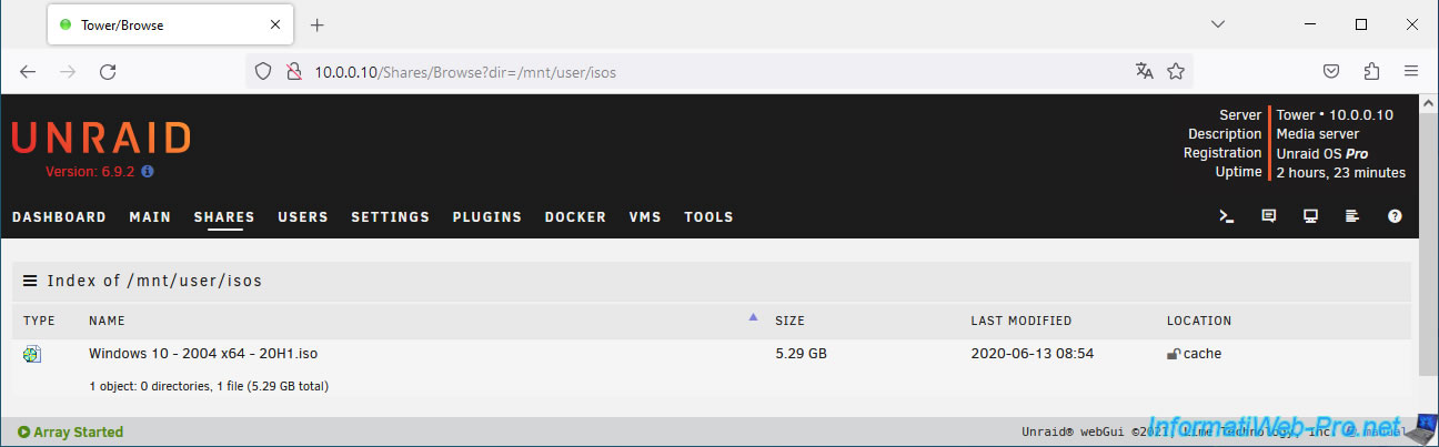 For this example, we added a file to the "isos" share, visible by default in the "Shares" tab of Unraid.