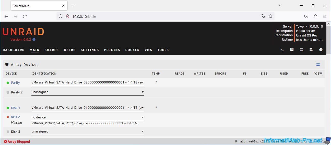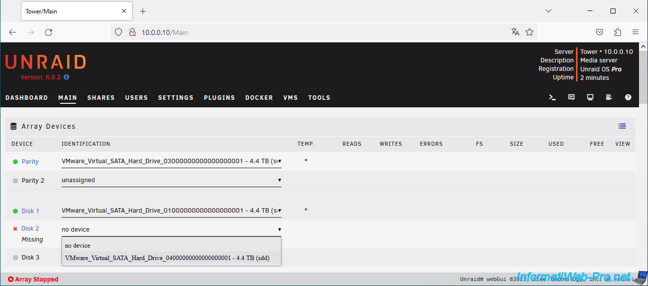If a disk in the array fails, you'll see in the "Main" tab that Unraid indicates that the affected disk is missing (Disk 2 Missing).