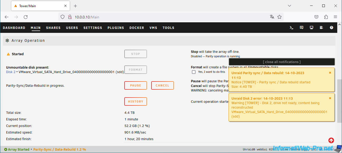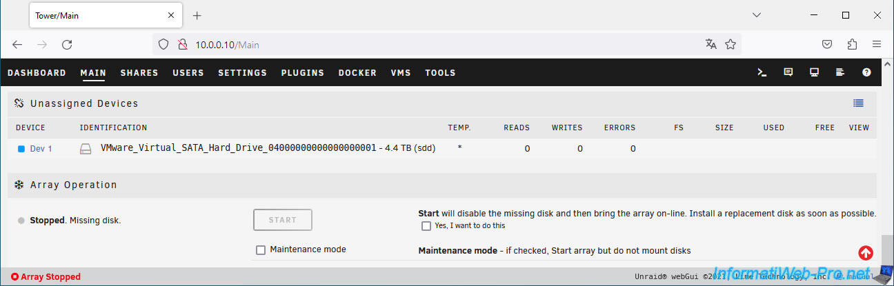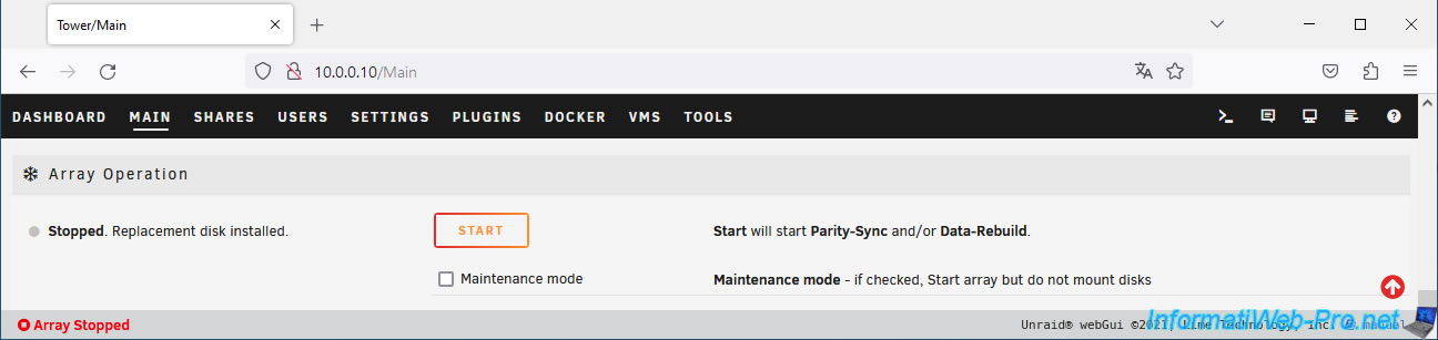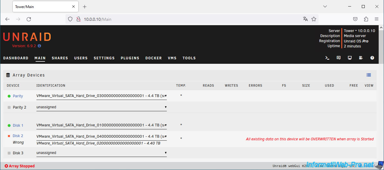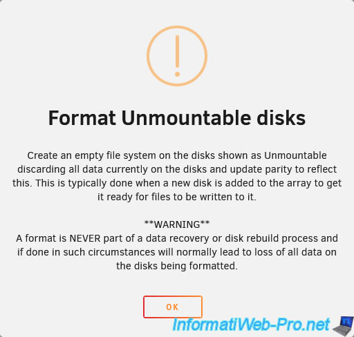 Important : Unraid warns you that all data on the selected disk will be overwritten (and therefore lost) when the array is started.
