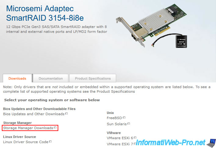 To get started, go to the review for your Microsemi Adaptec SmartRAID controller (in our case: Microsemi Adaptec SmartRAID 3154-8i8e), then click on the "Storage Manager Downloads" link.