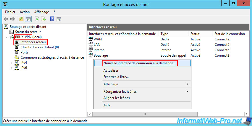 On the VPN server at Site 1 (Brussels), go to the "Network Interfaces" section and right-click "New Demand-dial Interface" in the right-hand section.
