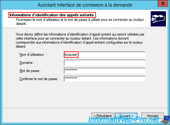 In the "Outbound Call Credentials" step, enter the credentials of the user account previously created on the remote site (in step "4.2. Create a user on Site 2 (Paris) so that Site 1 (Brussels) can connect to the VPN server at Site 2 (Paris)" of this tutorial).