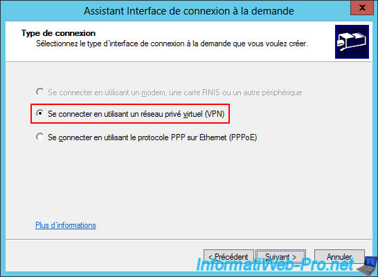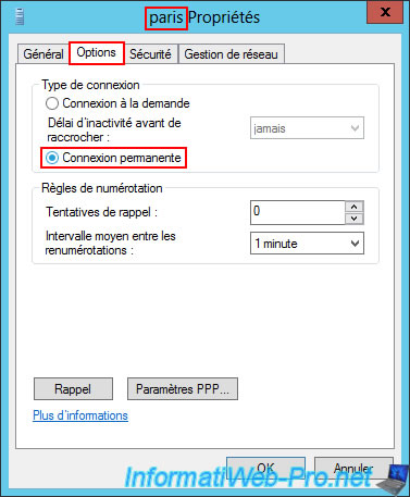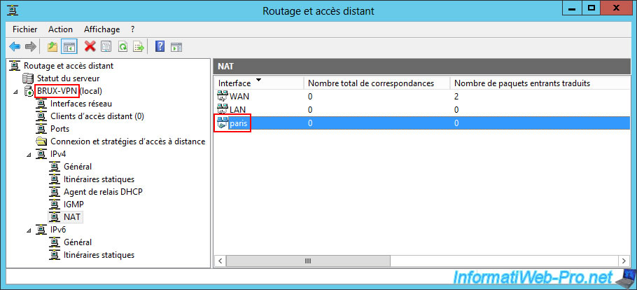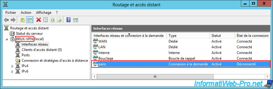 In the "Network Interface" section of the "BRUX-VPN" VPN server at Site 1 (Brussels), you will see that a "Paris" on-demand connection has been created (so you can access the resources at Site 2 (Paris) from your Site 1 (Brussels)).