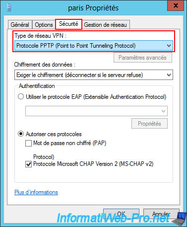In practice, you will need to enter the public IP address (provided by the ISP) of the remote site (site 2 (Paris)) and have correctly forwarded the VPN ports in the remote site's router.