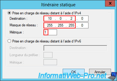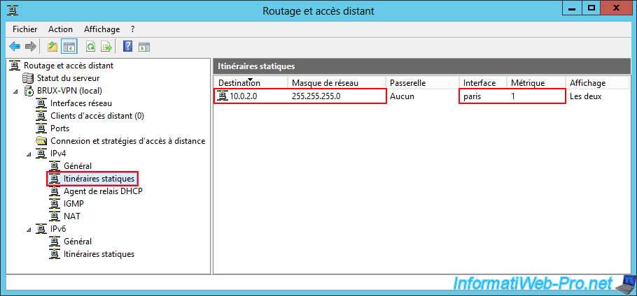 In the "IPv4 -> Static Routes" section, you will see that the static route (specified when creating the demand-dial connection) appears and that your server knows that the network ID "10.0.2.0" (which is the one used on site 2 (Paris)) will be accessible via the "paris" interface (the name of the demand-dial connection you just created).