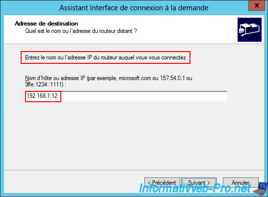 In the "Destination Address" step, Windows Server asks you to enter the IP address of the router you wish to connect to.
