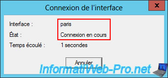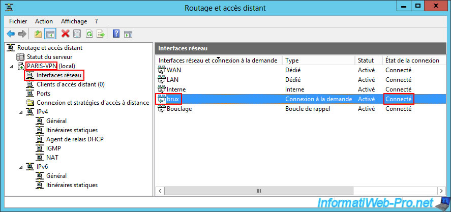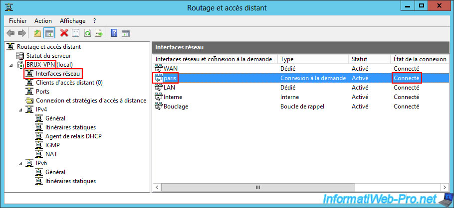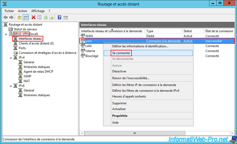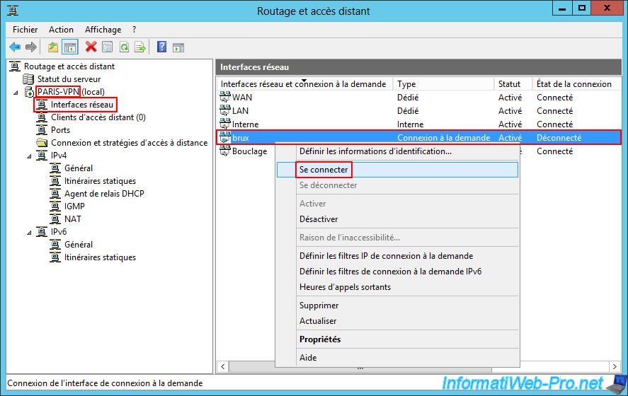 Similarly, go to the "Network Interfaces" section of your VPN server "PARIS-VPN" of site 2 (Paris) and right-click "Connect" on your "brux" on-demand connection interface.