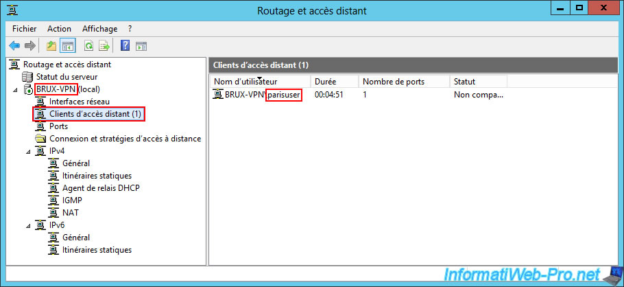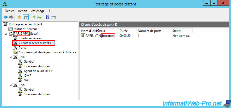 Similarly, on the remote VPN server "PARIS-VPN", you will be able to see that the Brussels site has connected to your Paris site with the user account "bruxuser" present on your VPN server "PARIS-VPN".