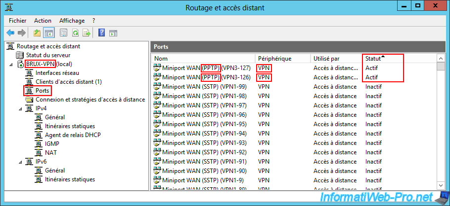 In the "Ports" section, if you sort the list by "Status", you will be able to see that the VPN protocol "PPTP" is used for the VPN tunnel established by Paris with your VPN server "BRUX-VPN" in Brussels.
