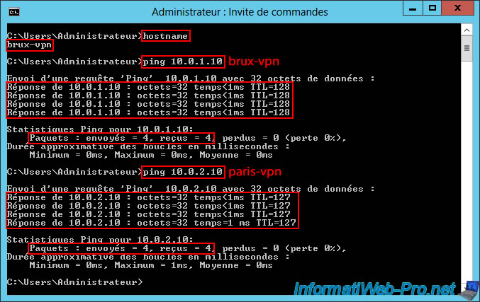 As you can see, in our case, our Brussels VPN server "brux-vpn" can communicate without any problems with itself (10.0.1.10), but also with the remote Paris VPN server "paris-vpn" (10.0.2.10).