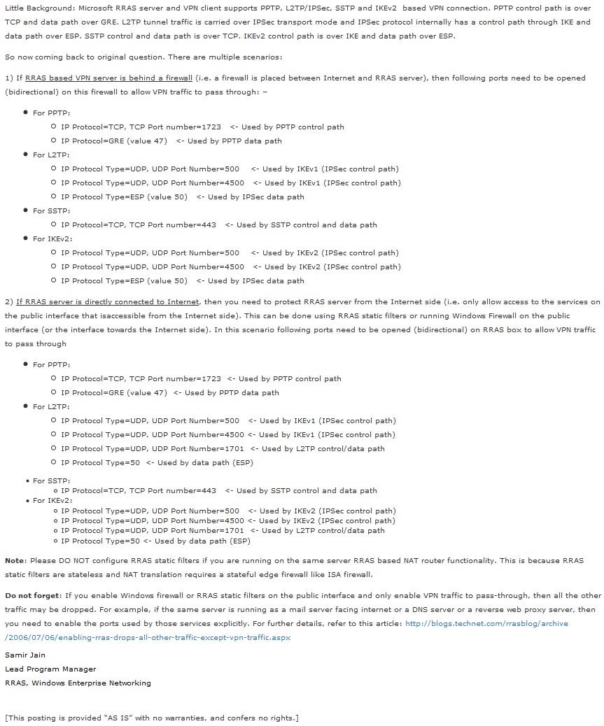 Note: this does not apply to the Windows firewall, which is, by default, correctly configured to allow the PPTP and L2TP VPN connections we will use in this tutorial.