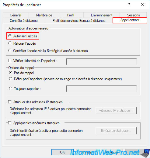Once the user is created, double-click on it and go to the "Incoming Calls" tab.
