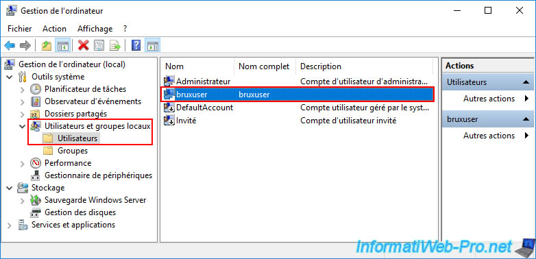 On the "brux-vpn" server at Site 1 (Brussels), open the "Computer Management" console and go to the "Local Users and Groups -> Users" section.