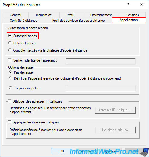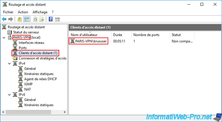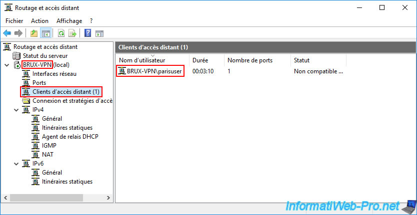 On this remote VPN server (PARIS-VPN), you can see this time that it is the user "bruxuser" who is connected to your remote VPN server.
