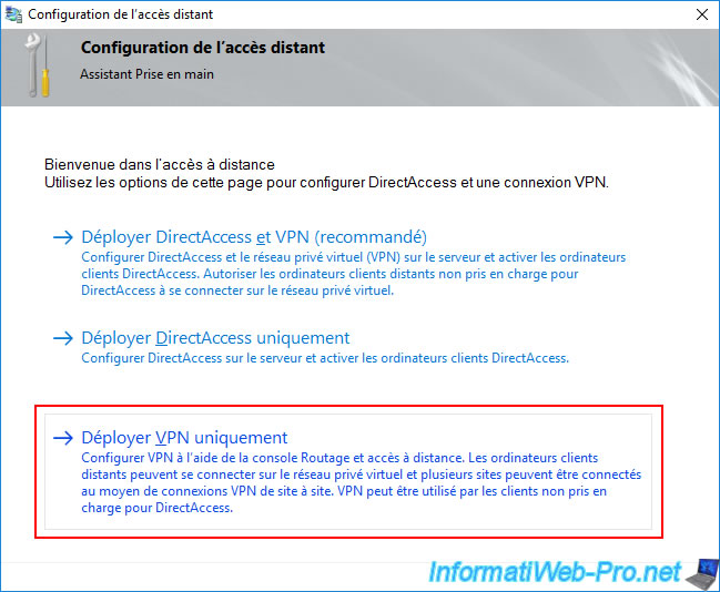 When the "Remote Access" role installation is complete, click the "Open Getting Started Wizard" link and click "Deploy VPN only".