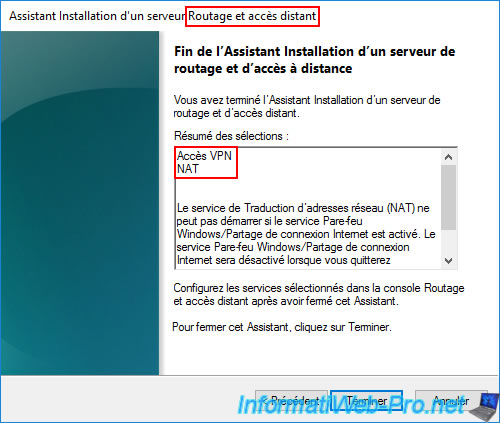 In the Routing and Remote Access (RRAS) console, launch the configuration wizard for this service and select "Custom Configuration," then select the "VPN Access" and "NAT" options.
