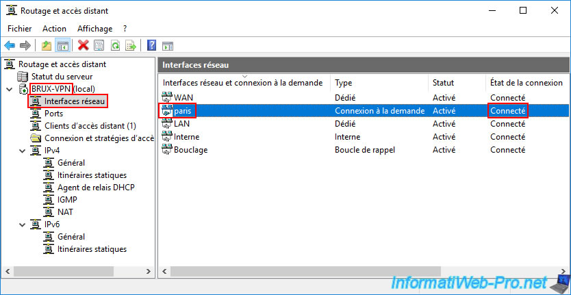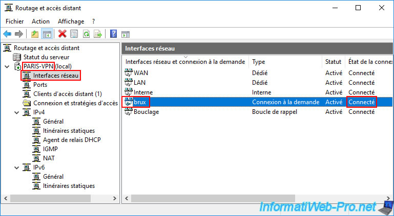 On your remote VPN server (PARIS-VPN), go to the "Network Interfaces" section and check that the on-demand connection created (in our case "brux") is connected.