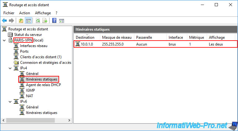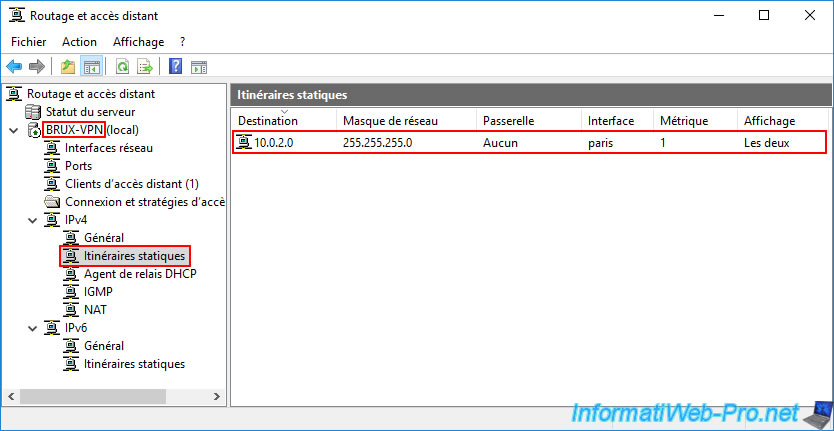 In the "Static Routes" section, you will see that the VPN server "PARIS-VPN" at Site 2 (Paris) knows that the subnet "10.0.1.0" is located at Site 1 (Brussels) and can access it via the network interface "brux".