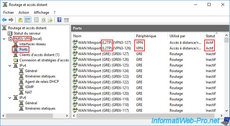 Again, in the "Ports" section of your "PARIS-VPN" VPN server (site 2), check that the active ports are those for the "L2TP" VPN protocol.