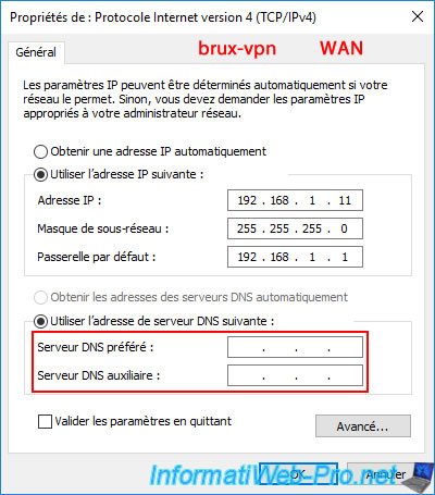 For the "brux-vpn" server at Site 1 (Brussels), modify the network configuration of your "LAN" network card and specify these IP addresses for: