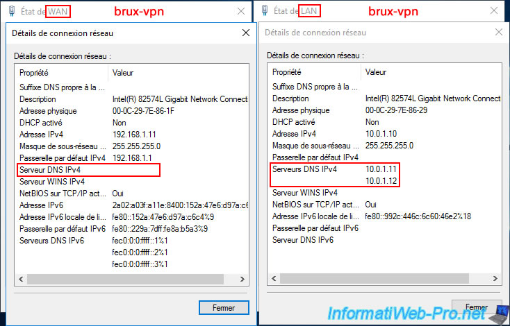 For the VPN server "brux-vpn", this gives this for the network configuration of its "WAN" and "LAN" network cards.