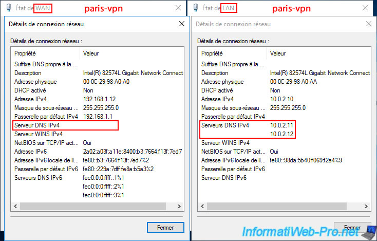 For the VPN server "paris-vpn", this gives this for the network configuration of its "WAN" and "LAN" network cards.