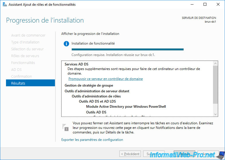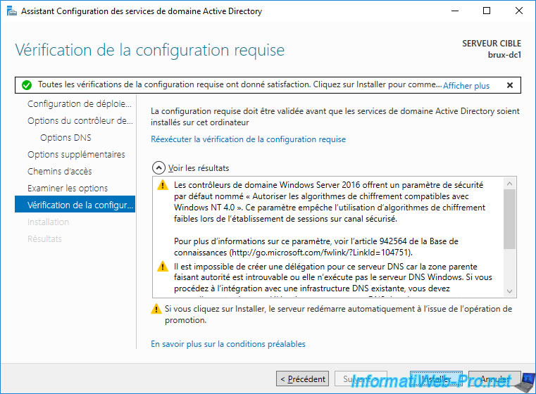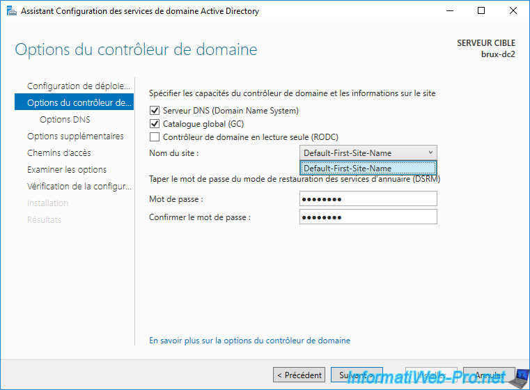 Note that by default, the domain controller will be added to the default Active Directory site "Default-First-Site-Name". Indeed, we will configure this once all the domain controllers have been created and linked together.
