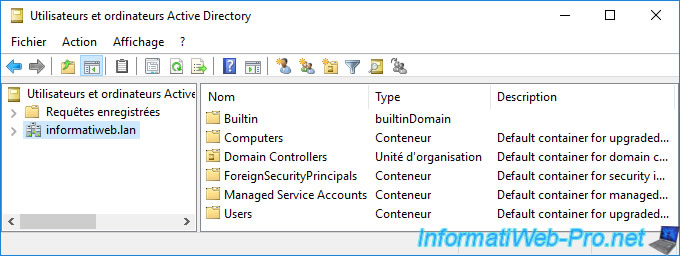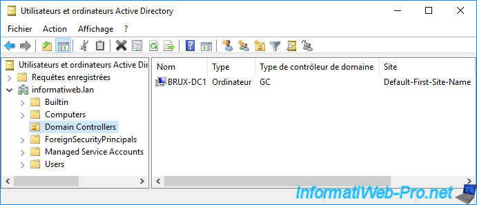 As you can see in the "Active Directory Users and Computers" console, our "informatiweb.lan" domain currently contains only one domain controller named : BRUX-DC1.