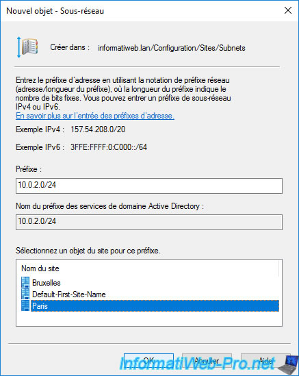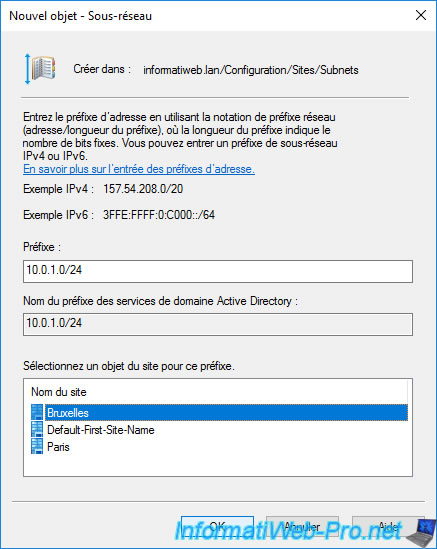 So, we specify this subnet in the "Prefix" box and we select the "Brussels" site to specify to Active Directory that this subnet is located at the Brussels site.
