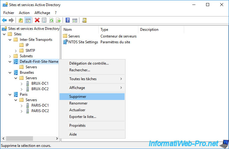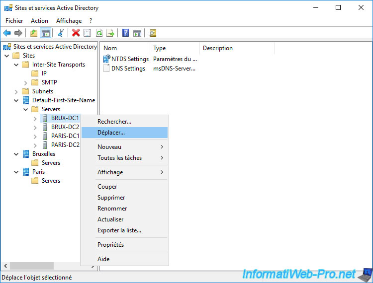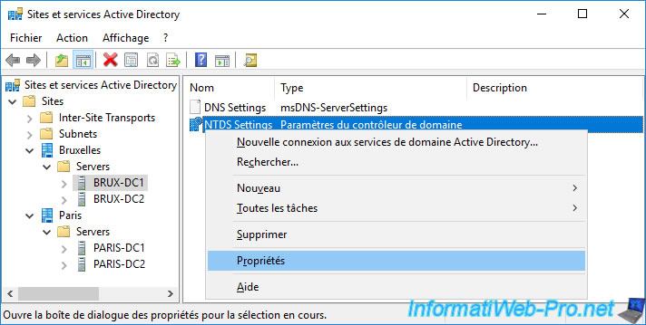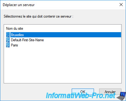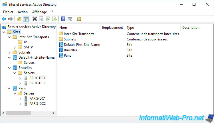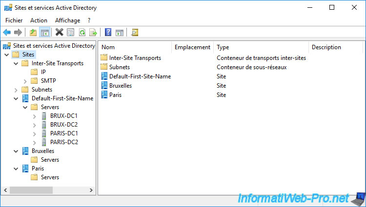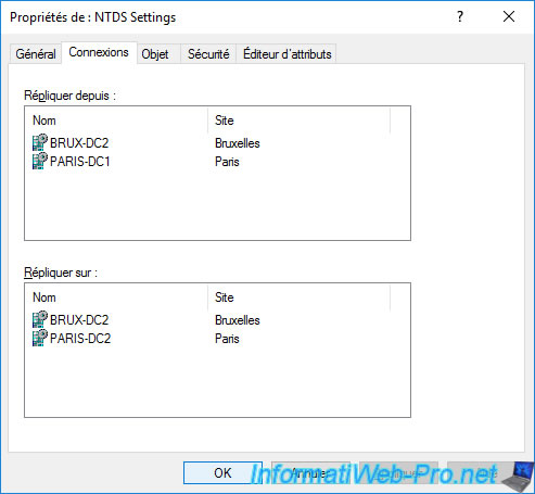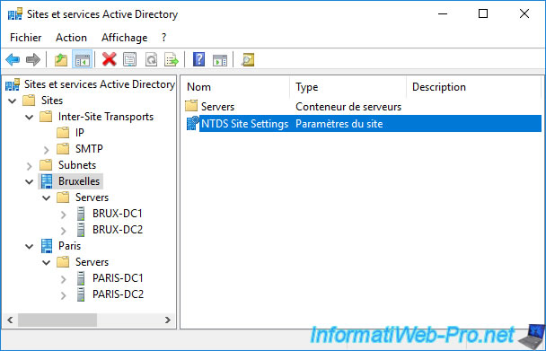 Active Directory replication between the Brussels site and the Paris site will therefore be carried out between the "BRUX-DC1" server (of Brussels) and the "PARIS-DC1" server (of Paris).