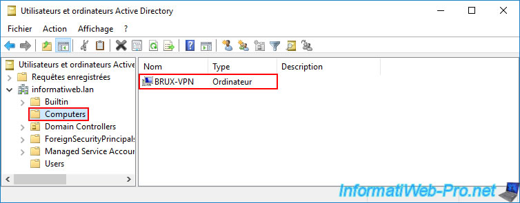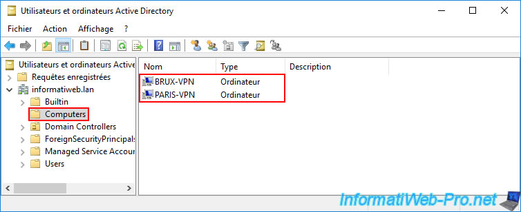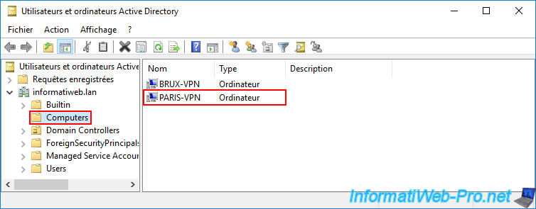 If you go to the VPN server "paris-vpn" of the remote site (Paris), you should see this same computer account "BRUX-VPN" appear.