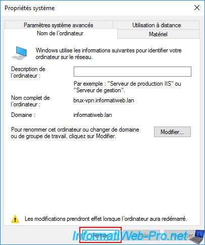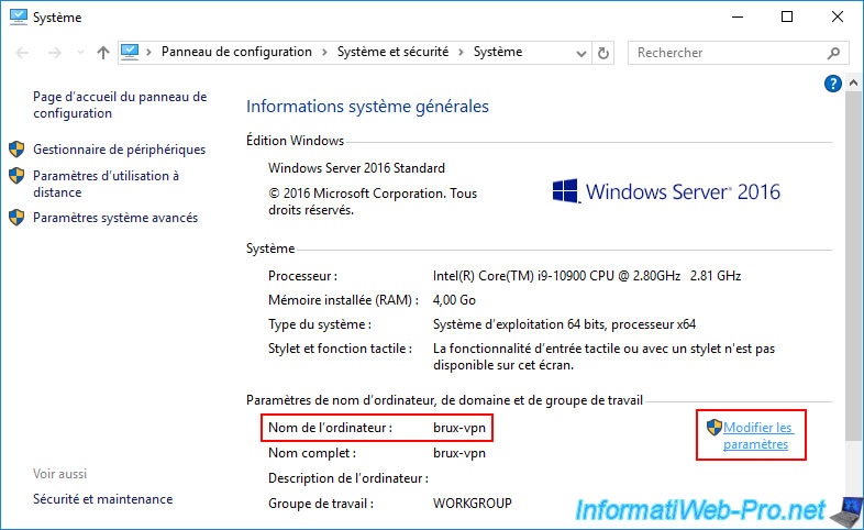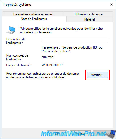 Then, display the system properties of this VPN server "brux-vpn" and click on the "Change settings" link.