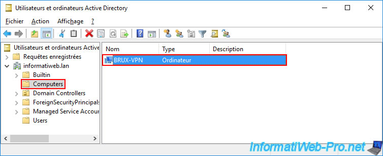On the local AD domain controller (in our case: brux-dc1), we can see that a computer account "BRUX-VPN" has appeared in the "Computers" folder of this AD server.