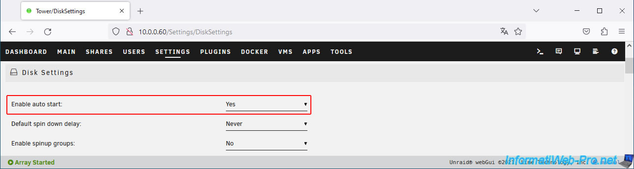 To avoid manually starting the array each time, enable the "Enable auto start" setting in "Settings -> Disk Settings".