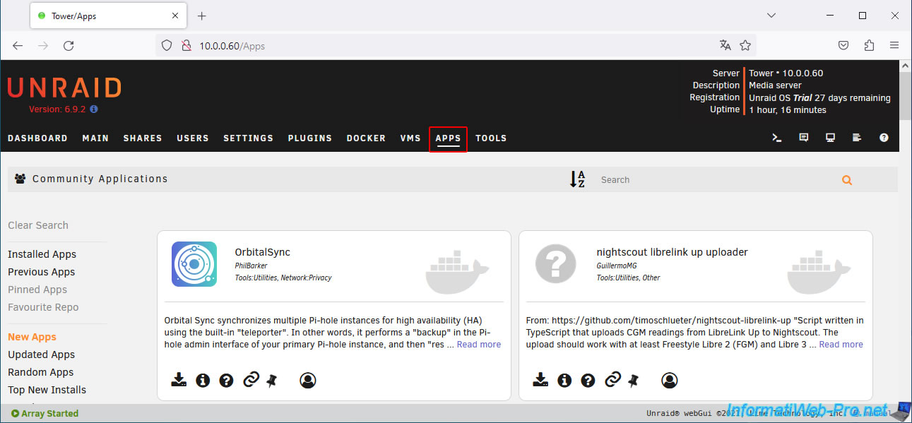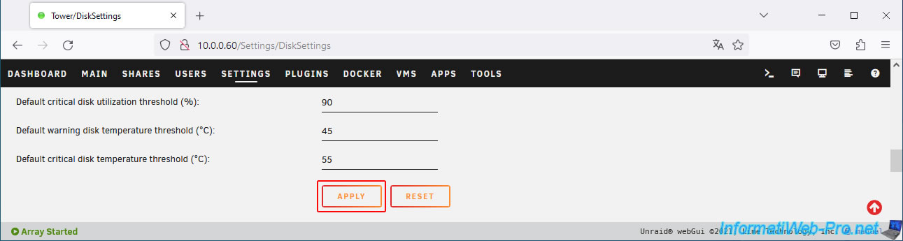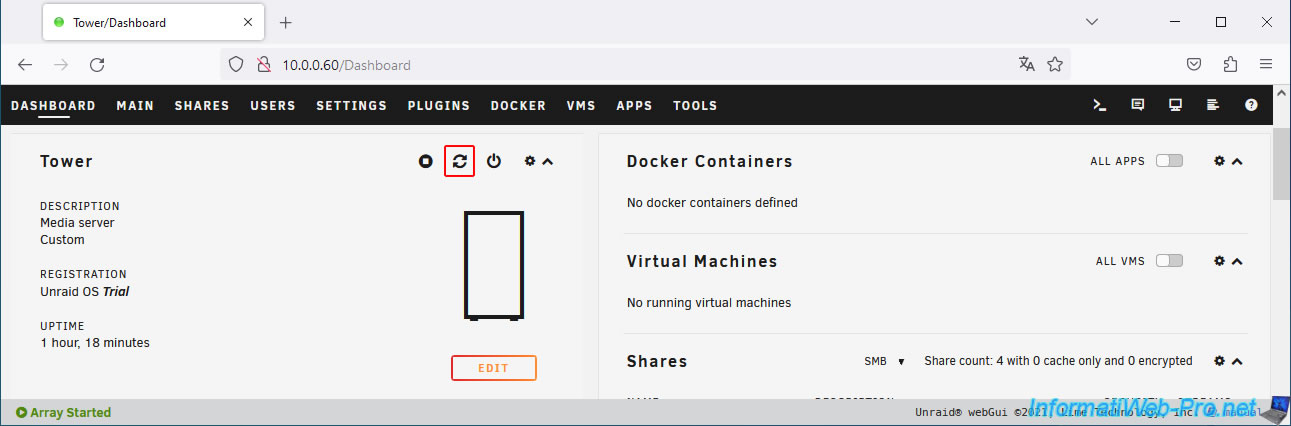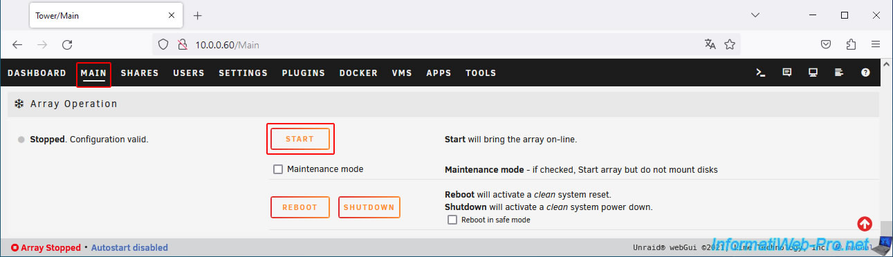 Once your Unraid server has restarted, go to the "Main" tab and click the "Start" button at the bottom of the page.